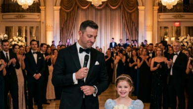 The grand ballroom of the Harrington estate was a cathedral of excess. Above the polished marble floors, massive crystal chandeliers shimmered like captured galaxies, casting a golden glow over a sea of silk gowns and impeccably tailored tuxedos. The air was thick with the scent of expensive perfume, aged scotch,…