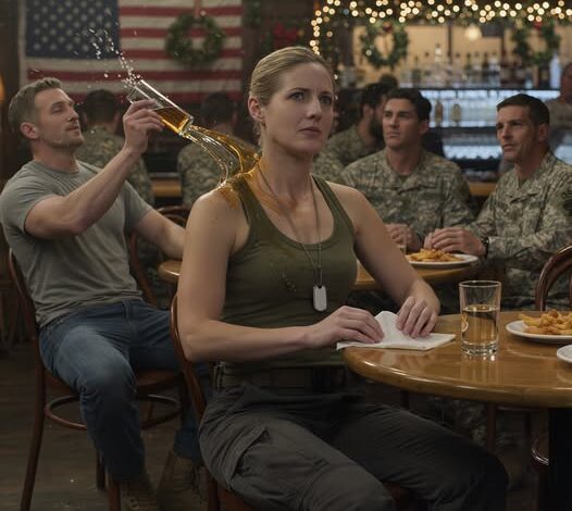 She didn’t react when the beer hit her table. Didn’t flinch when the amber splash rolled over her fries. Didn’t lift her eyes when the laughter rose from three tables over—sharp, careless, the kind of laughter men use when they think the room belongs to them.