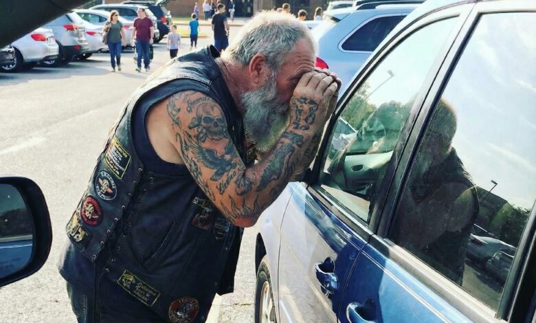 It was two o’clock on a Tuesday afternoon. I was early for school pickup, scrolling through work emails while sitting in my car. That’s when I saw him. He was enormous—a mountain of a man in a black leather vest, a grey beard reaching his chest, and tattoos covering his arms. He walked slowly through the parking lot, stopping at each parked car, cupping his hands around the glass to peer inside.