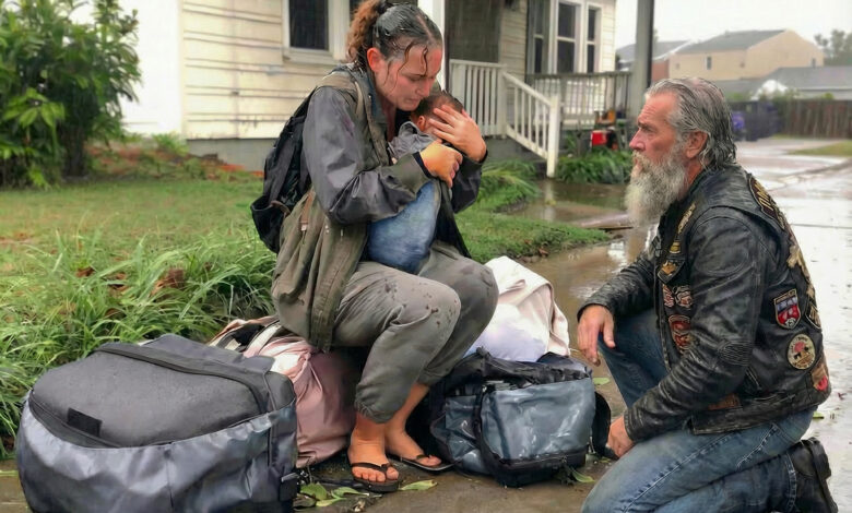 The biker didn’t hesitate. He peeled off his leather vest—covered in patches I could tell meant something to him—and wrapped it around me and Lily, shielding us from the wind.