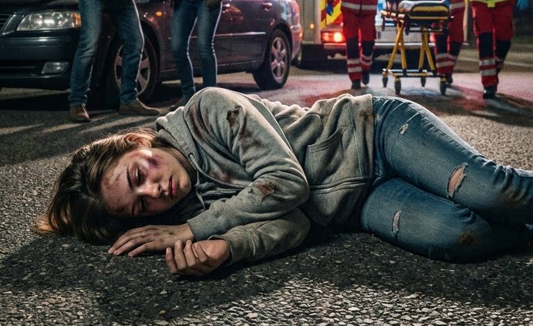 I didn’t raise the phone or speak clearly. I didn’t have to. Three broken words slipped out, carrying location and desperation, enough for the line to stay open. Then I let my body go slack and slid halfway out of the car, skin meeting burning asphalt. Blood pooled beneath me, stark against the gray pavement, and for a split second the world went utterly quiet.