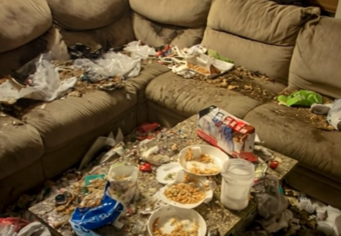 In the kitchen, the sight was even more repulsive. Pizza crusts and greasy napkins were piled high on the counters, and the sink overflowed with stagnant water and unwashed dishes. It was as if a storm of negligence had swept through the house, leaving a trail of filth that felt intentional.