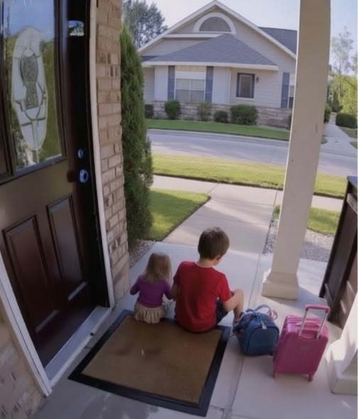When I pulled into the driveway that afternoon, the sight waiting for me nearly stopped my heart. My two kids—Carmy, ten, and Etta, seven—were sitting on the front steps with their suitcases beside them. No trip was planned. No reason they should’ve been there. I jumped out of the car…