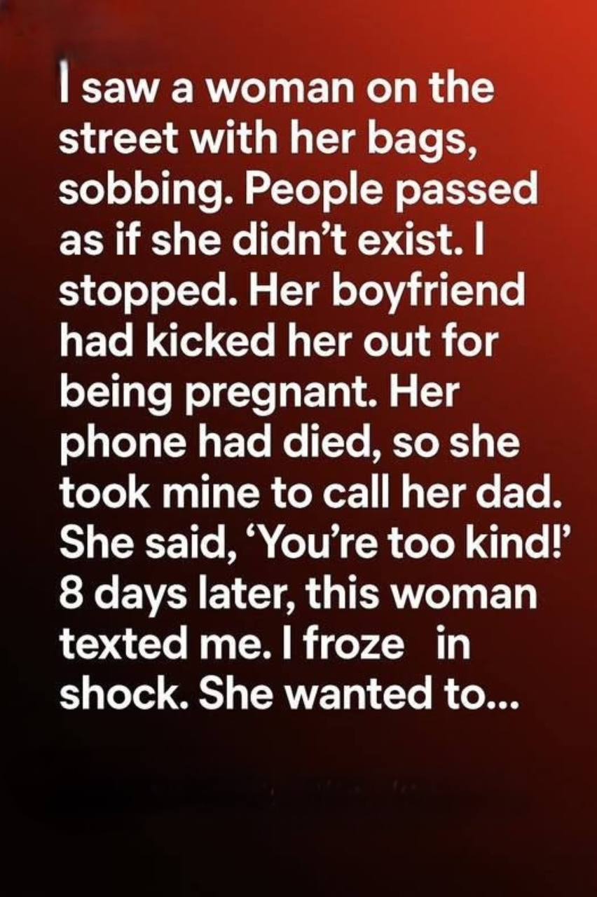 I saw a woman on the street, sitting on the curb with her bags beside her, sobbing as strangers walked by pretending not to notice. Something in me wouldn’t let me do the same. I stopped, crouched down, and asked if she was alright. Through trembling words, she told me…