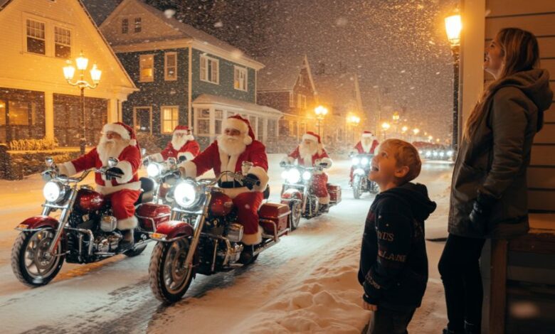 Residents peeked through curtains at the noise, expecting trouble — but what they saw instead made their breath hitch. Flashing red hats. Strings of lights wrapped around handlebars. Saddlebags overflowing with wrapped gifts. Twenty Santas on motorcycles rolling down their tired street.