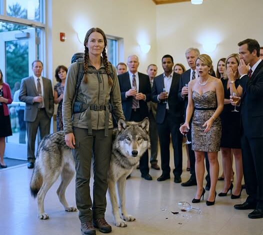 A low, instinctive silence swept the room as a gray-white wolf stepped across the threshold first, lean muscle rolling beneath thick fur, amber eyes calm but alert. He moved with the quiet authority of something that did not need permission to exist. Behind him came a woman dressed for the desert rather than nostalgia—dust-worn boots, utility pants, dark hair braided down her back, a leather satchel resting against her ribs like armor.