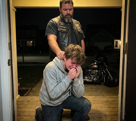 The silence of the quiet suburban street was violently fractured at 10 PM. The piercing beam of a Harley Davidson headlight sliced through the darkness, followed by the seismic growl of a powerful engine that announced a confrontation far beyond the typical neighborhood dispute. Marcus’s mother watched from the window as a colossal figure dismounted—Dean Morrison, leather vest bristling with motorcycle club (MC) patches, arms heavily tattooed, the unmistakable presence of a man accustomed to commanding immediate respect. Stumbling behind him was Tyler Morrison, thirteen, sobbing, his face streaked with tears that reflected the harsh streetlights.